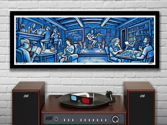 OPEN MIC NIGHT - 3D Panoramic Acoustic Coffee Shop Illustration with red/blue Glasses - 11.75x36" - Signed Limited Edition Art Print