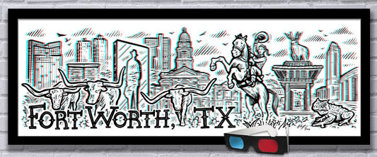Fort Worth, TX - Old School 3D Panoramic Poster with red/blue Glasses - 11.75x36" - Signed Limited Edition Art Print