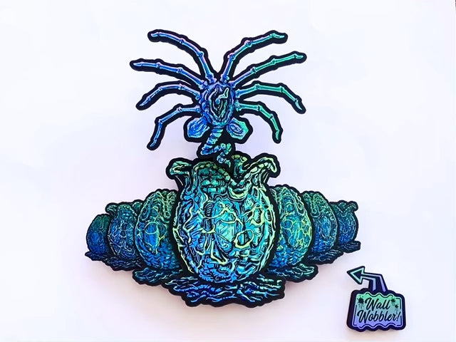 This guy really pops, hovering and wobbling 1” beyond its open egg on a wood and spring mount. Further, a custom built-in hanging system makes displaying it a breeze, and extends the entire design a further 1/2” off the wall for added depth and dimensionality. A perfect addition to any home theater, game room, arcade, man cave, or living room.