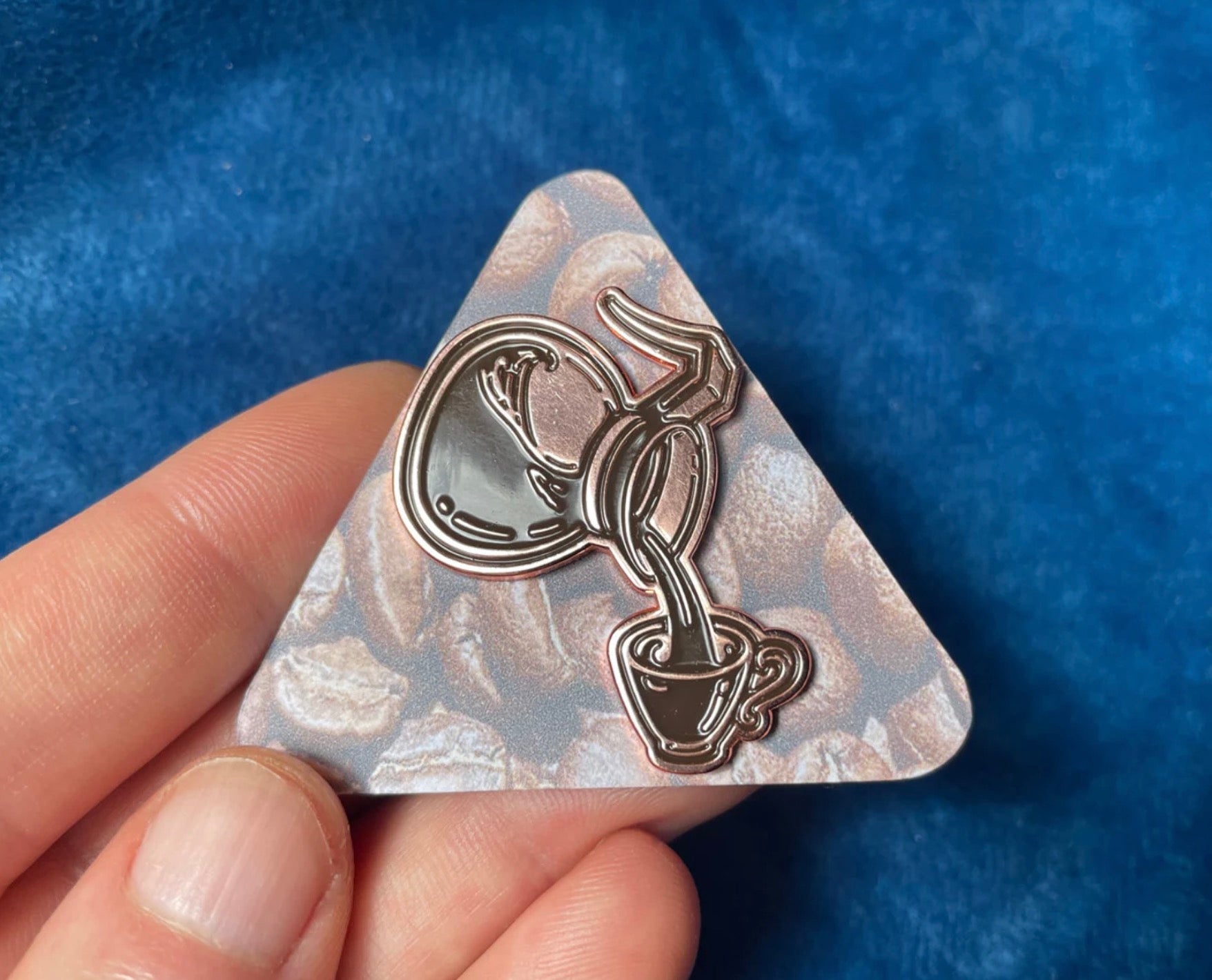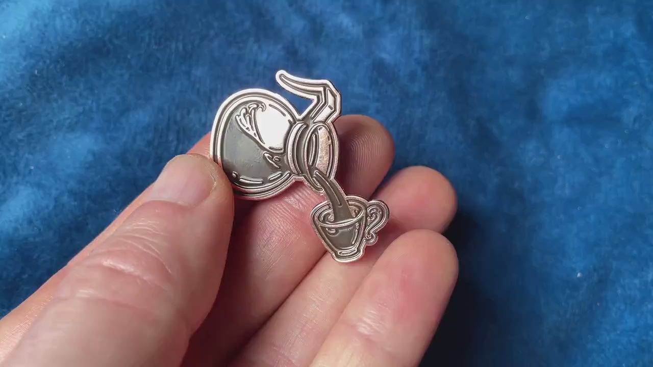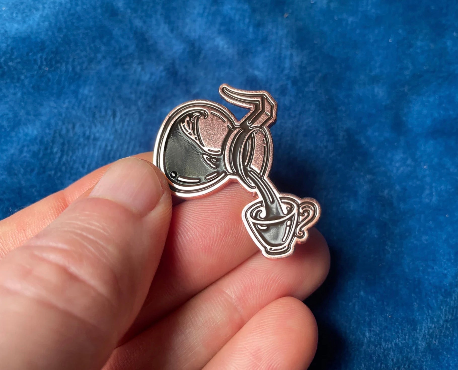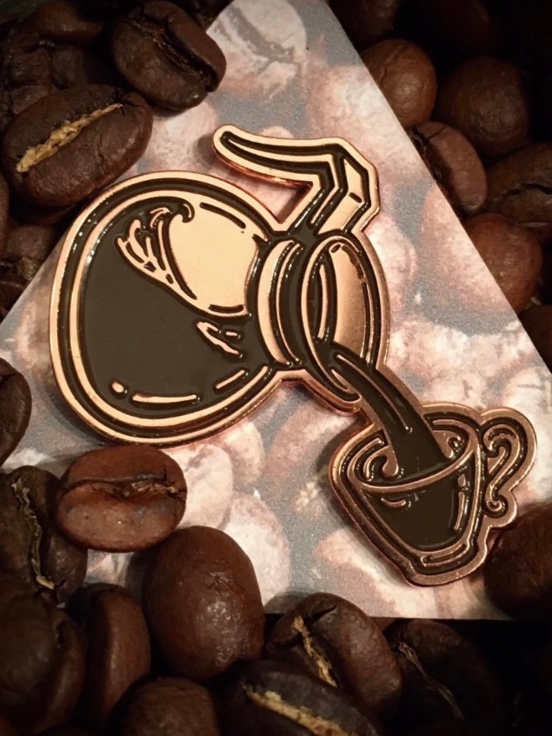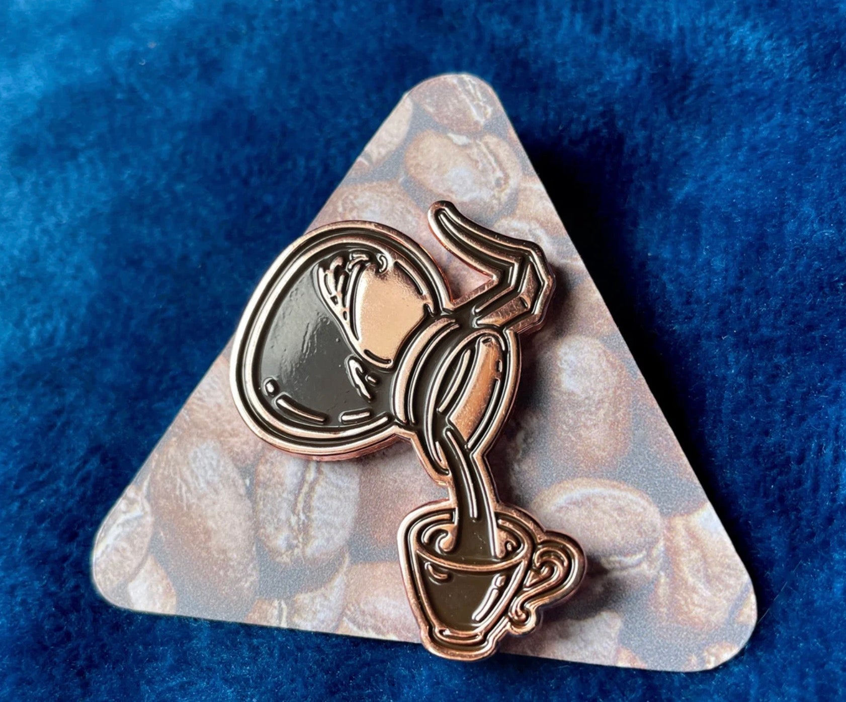 Dark Chocolate Enamel and Antique Bronze Lapel Pin, with soft durable rubber pin clasp backer. Single centered clasp allows the wearer to 'pour' the coffee while displaying.