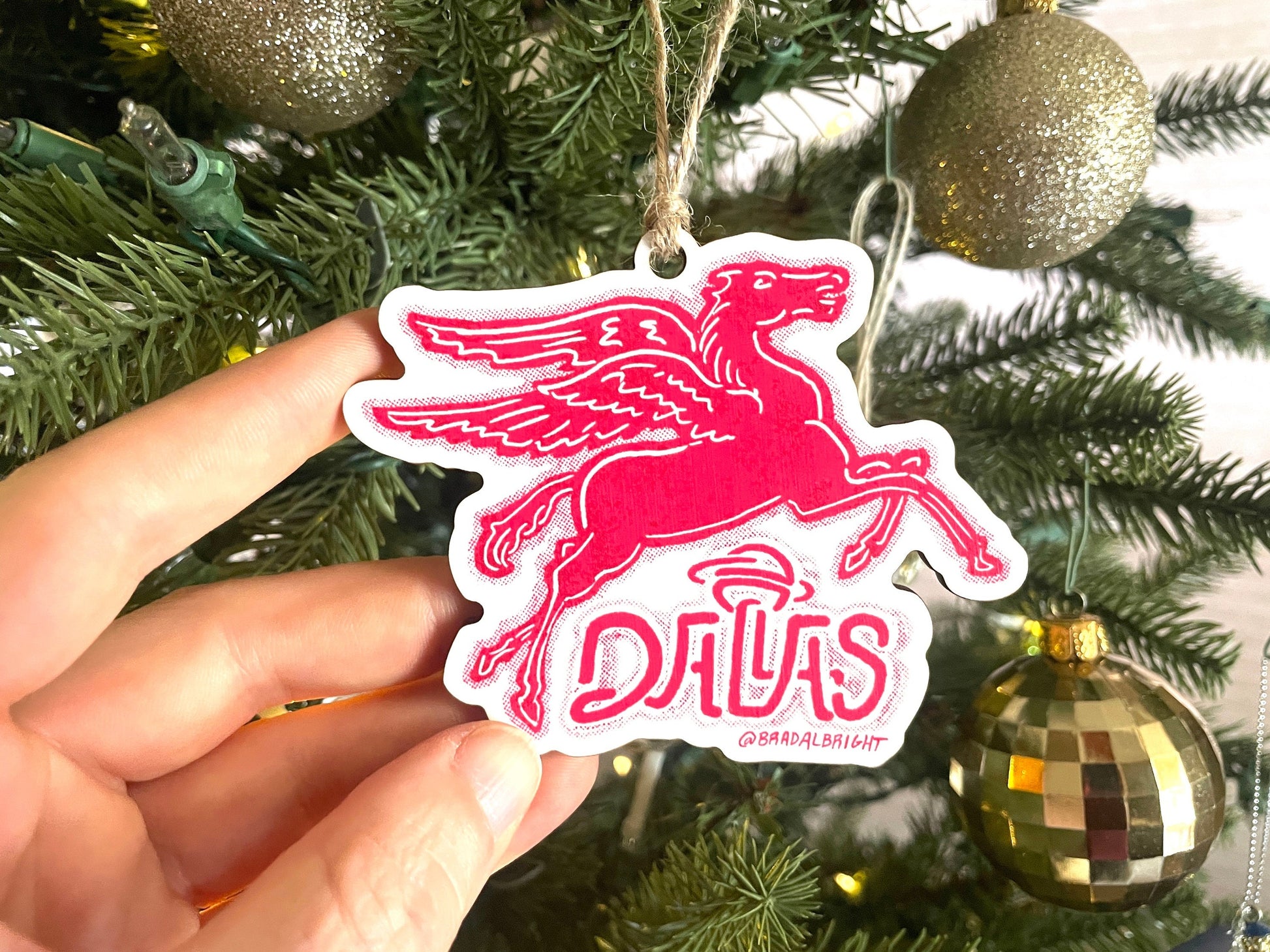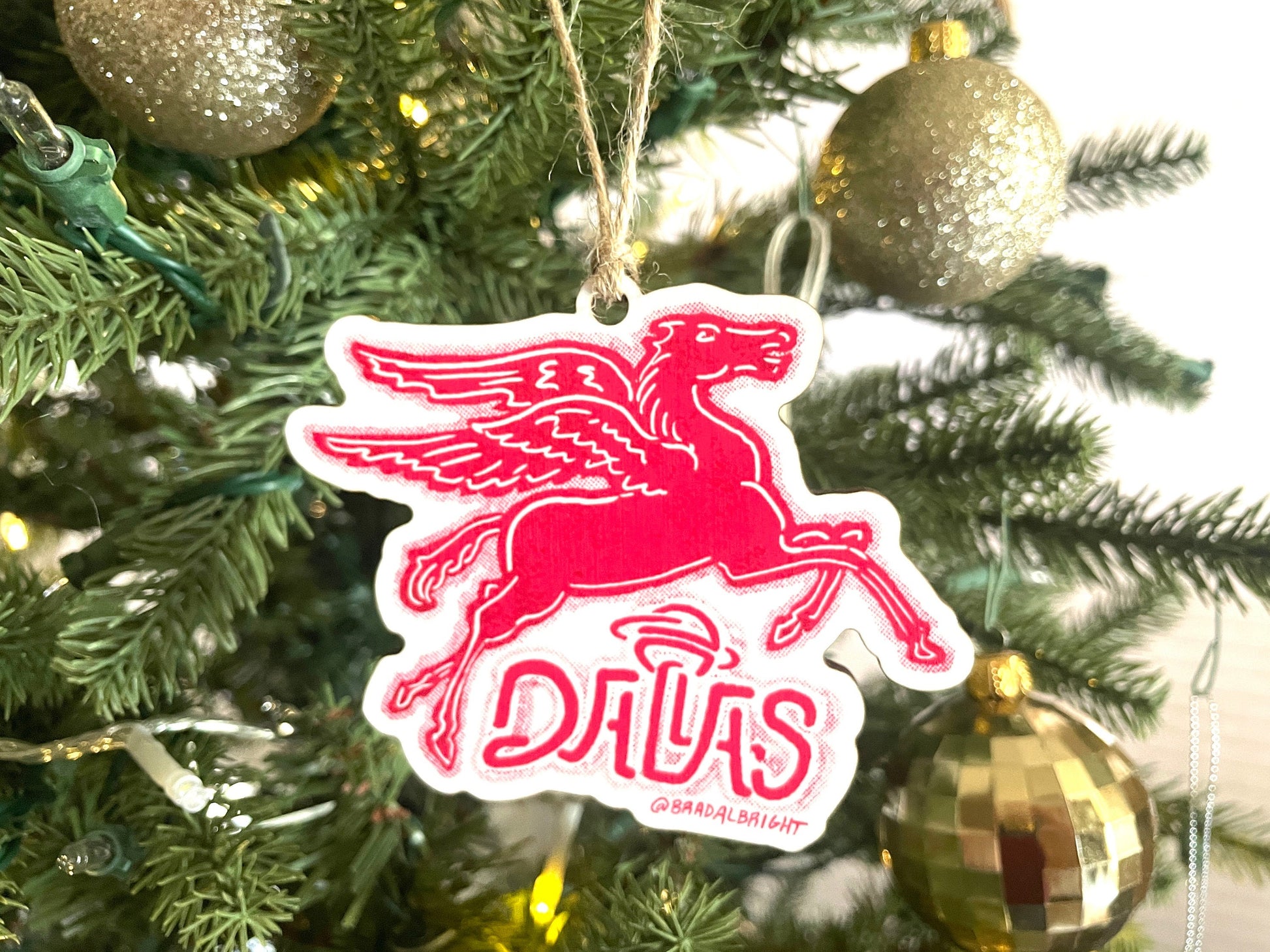 Iconic Dallas Pegasus sign in ornament form! Lovingly hand illustrated, printed and assembled by Dallas artist Brad Albright.