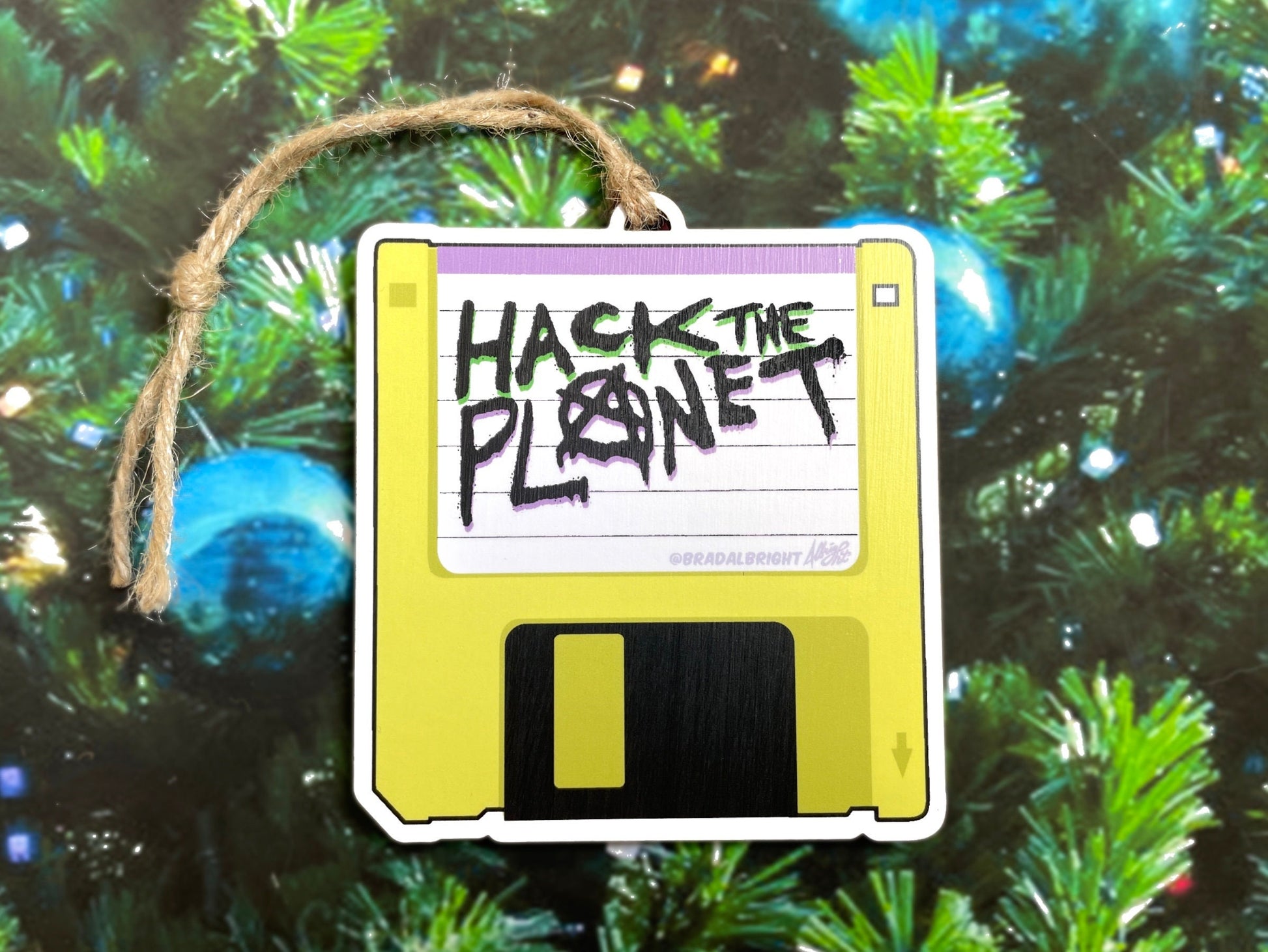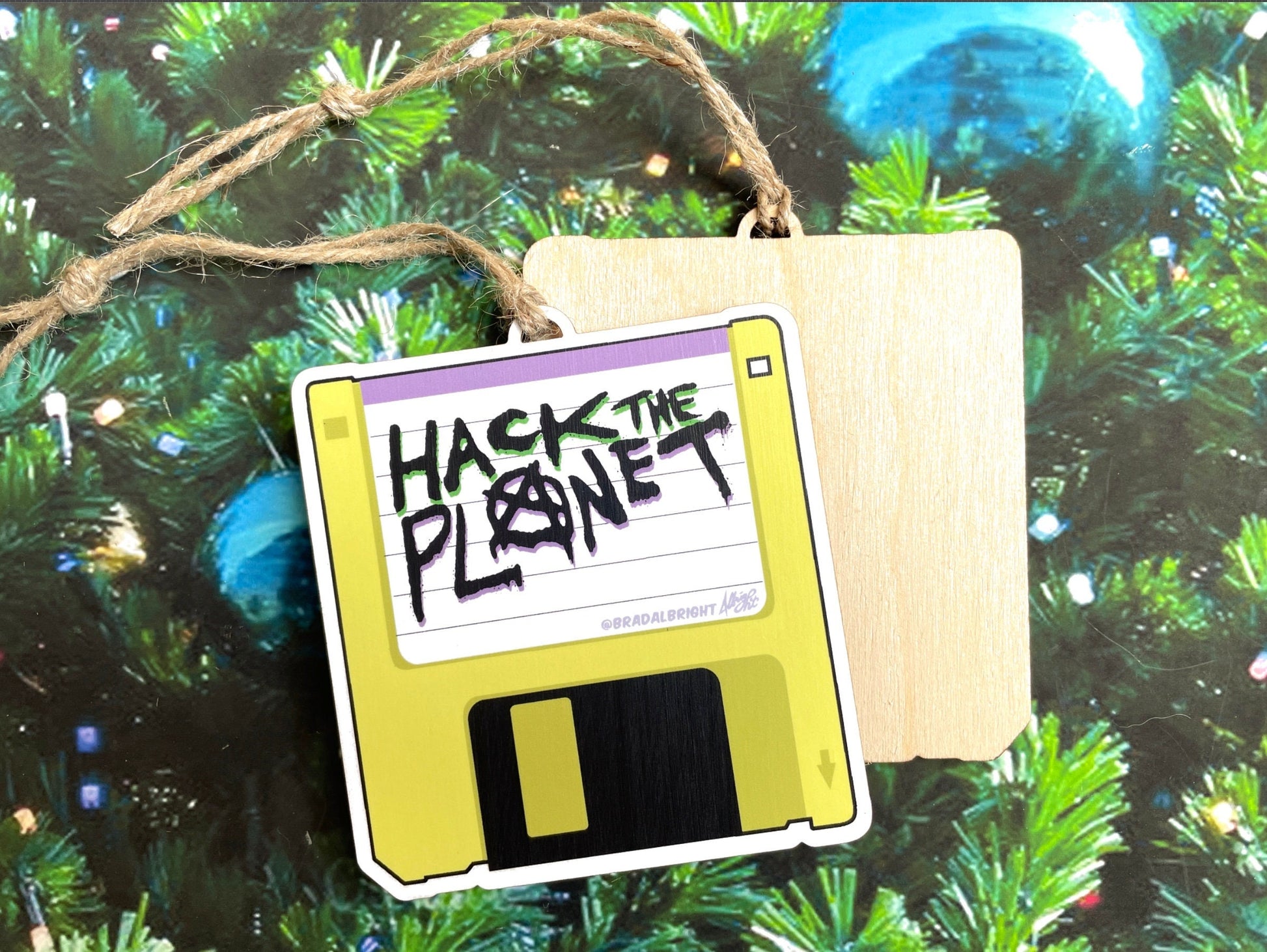Hack The Planet! Floppy Disk Hackers Ornament - Wooden Cyberpunk Christmas Decoration