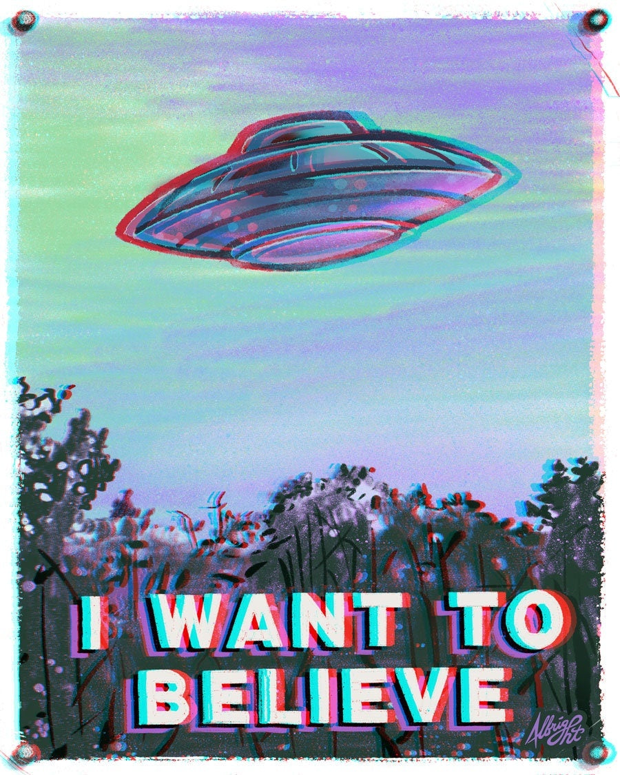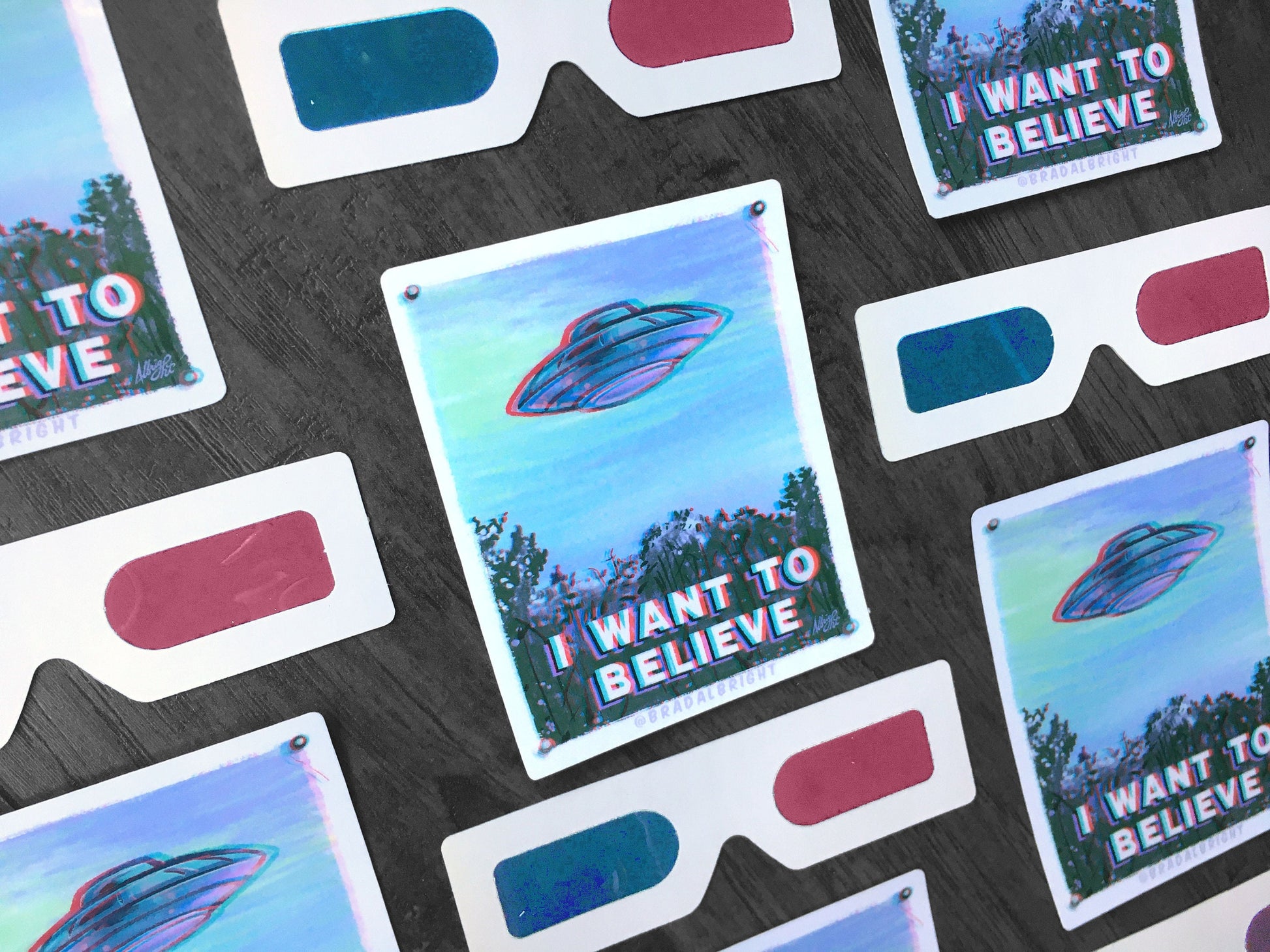 "I Want To Believe!" It's Fox Mulder's iconic office poster from The X-Files, lovingly reimagined and hand-drawn with all new detail and... what's this?? It's 3D!! Mini 3D glasses included!