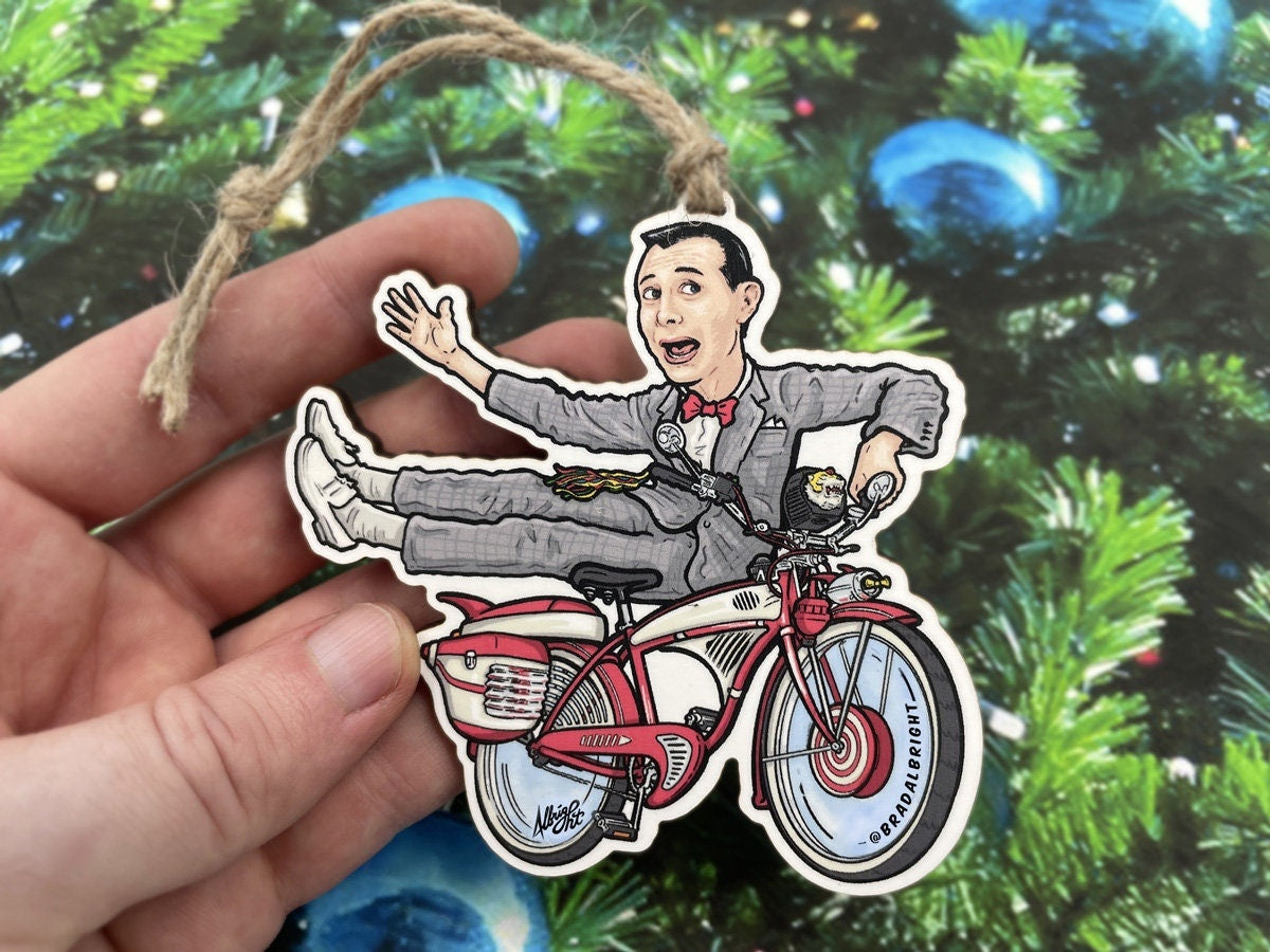 Pee Wee & His Bike - Ornament - Wood and Archival Giclee Print - Hand Drawn Wood Ornament