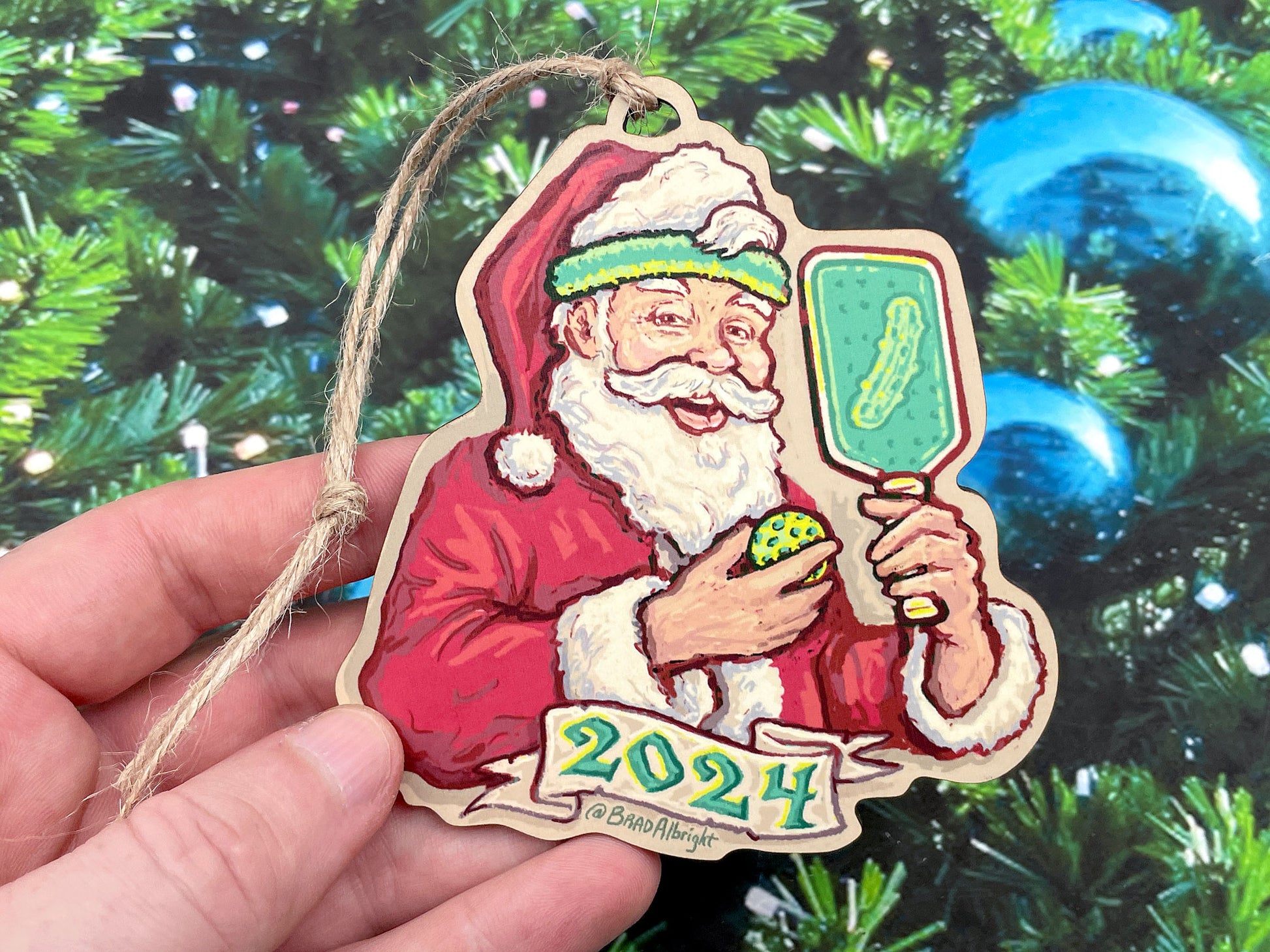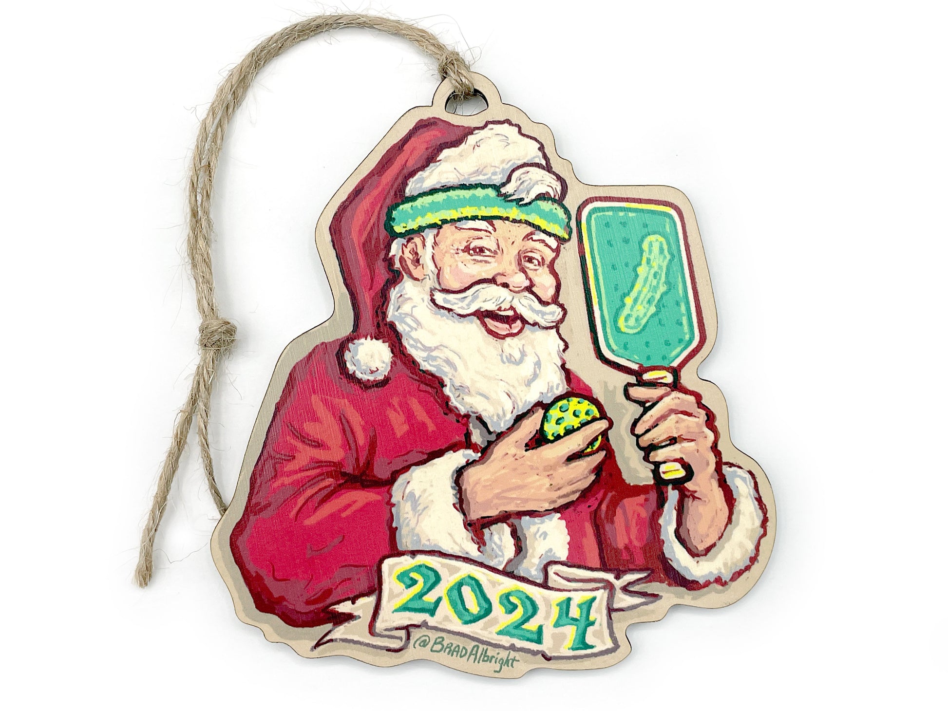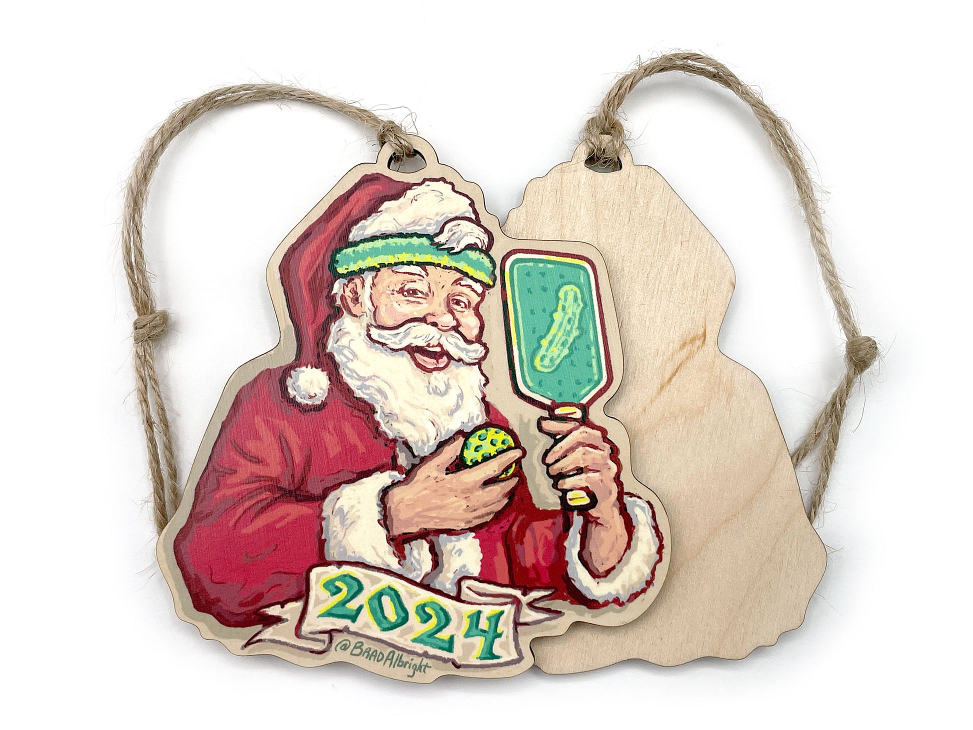 Outta the kitchen and onto the court, Santa’s trading cookies for the pickleball sport. Naughty or nice, you just might deserve, Santa delivering an underhand serve. Featuring an original vintage-style Santa Claus illustration by artist Brad Albright.