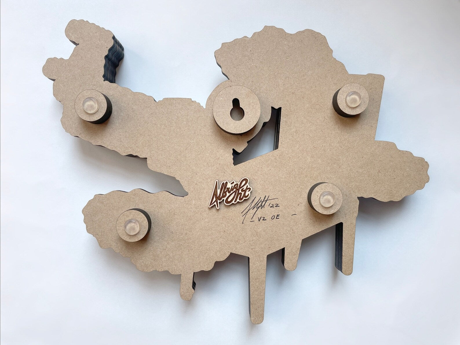 Ships with custom built-in hanging gear and an interlocking bear-claw screw, providing a safe and secure wall mount that seems to float magically off the wall for extra dimensionality. Signed and numbered by the artist, open edition with engraved Albright badge. numbering may vary from photo.