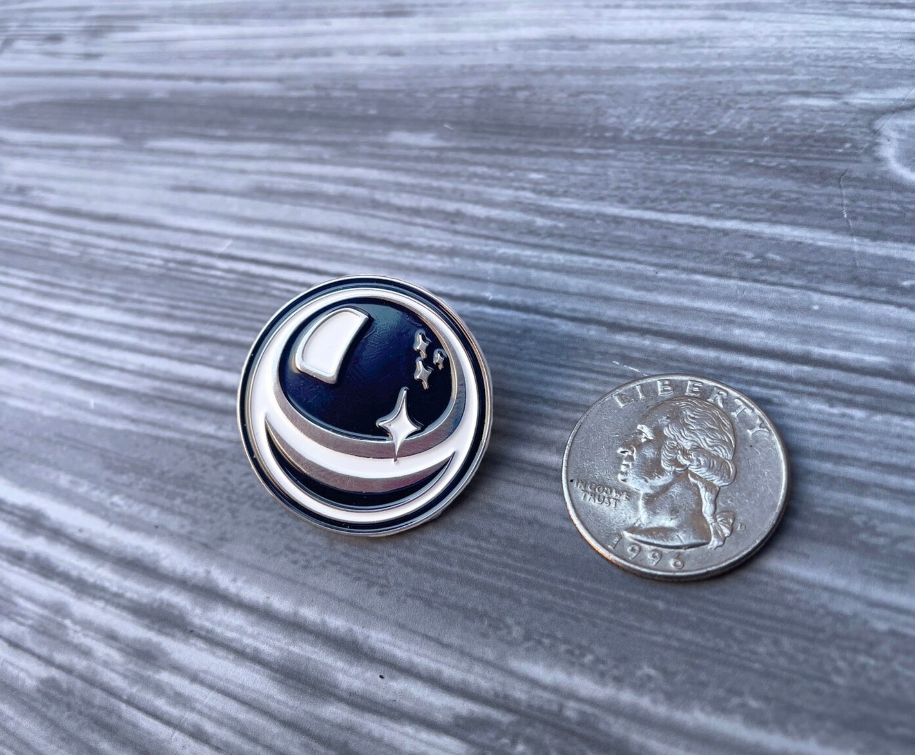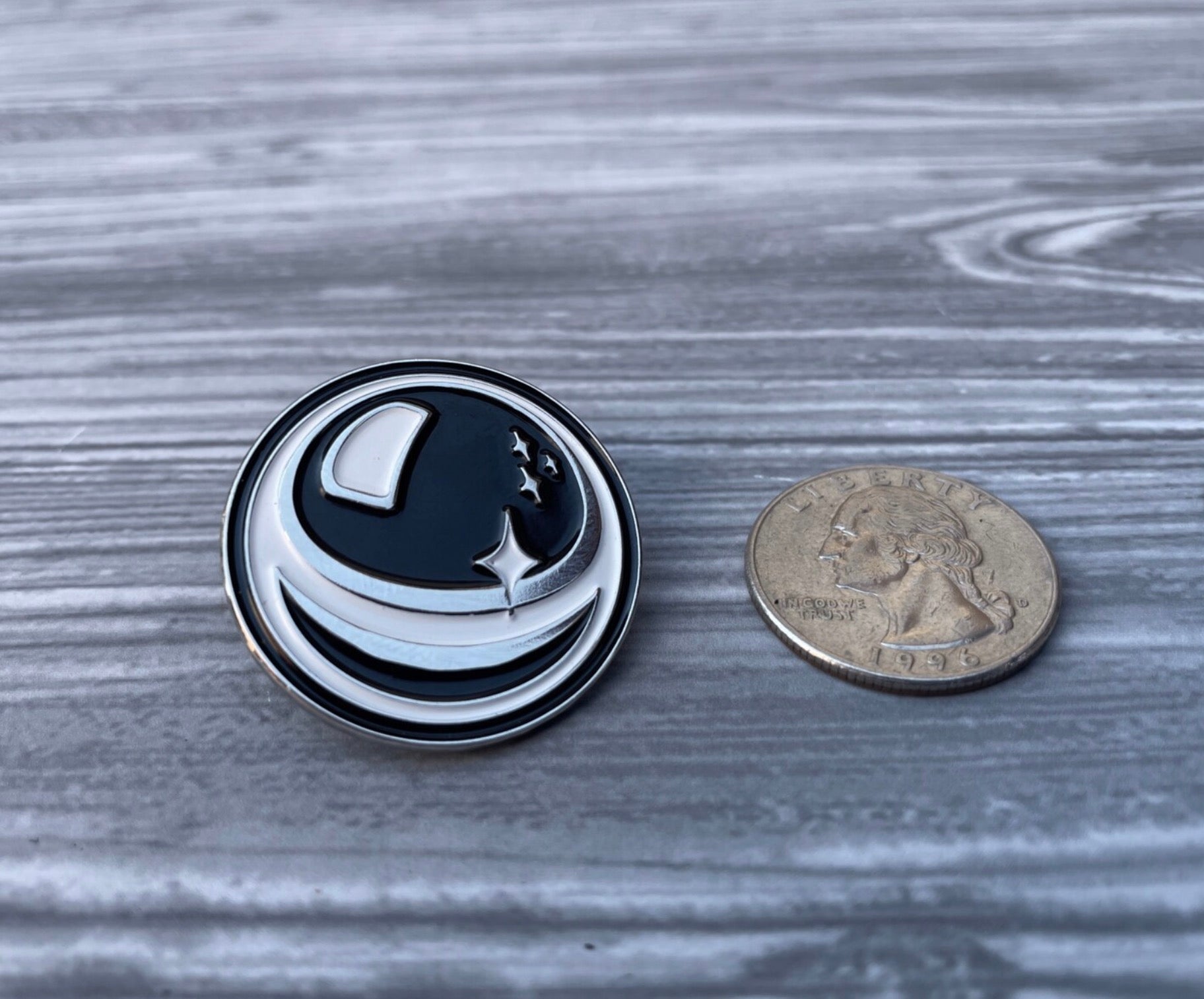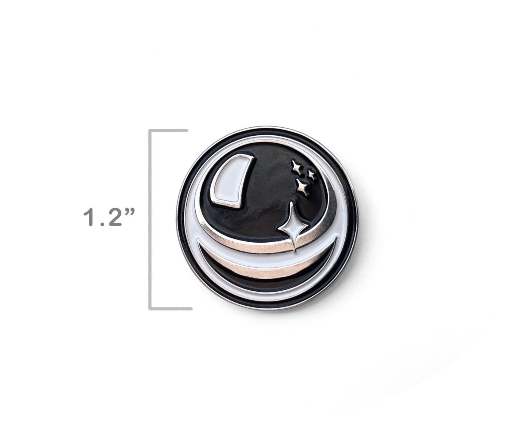 Black & White Enamel on Chrome Nickel, with soft durable rubber pin clasp backer.