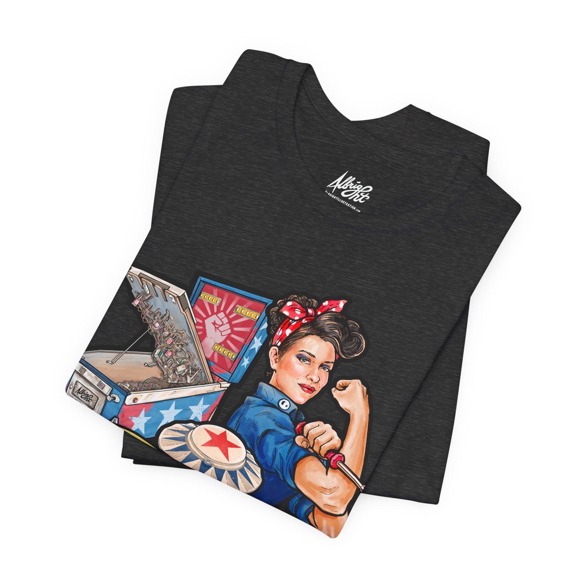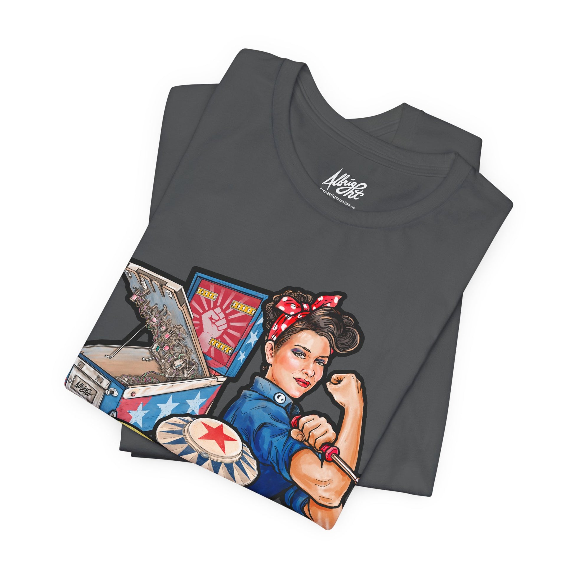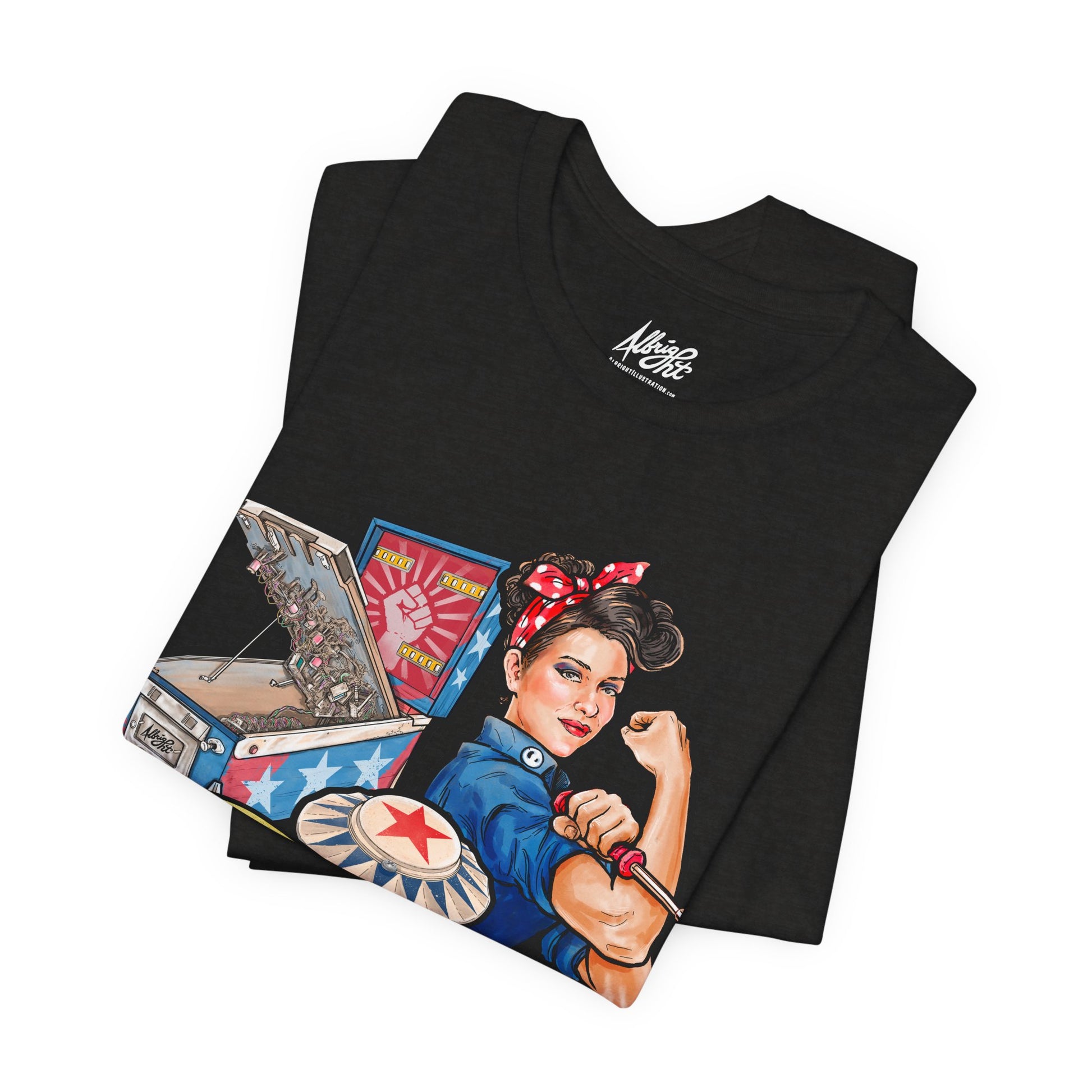 If Rosie The Riveter played pinball, she’d 100% be a tech. Celebrating women in pinball and hobbyists of all shapes, sizes, genders, and styles who take it upon themselves to learn how to fix it. We can do it!