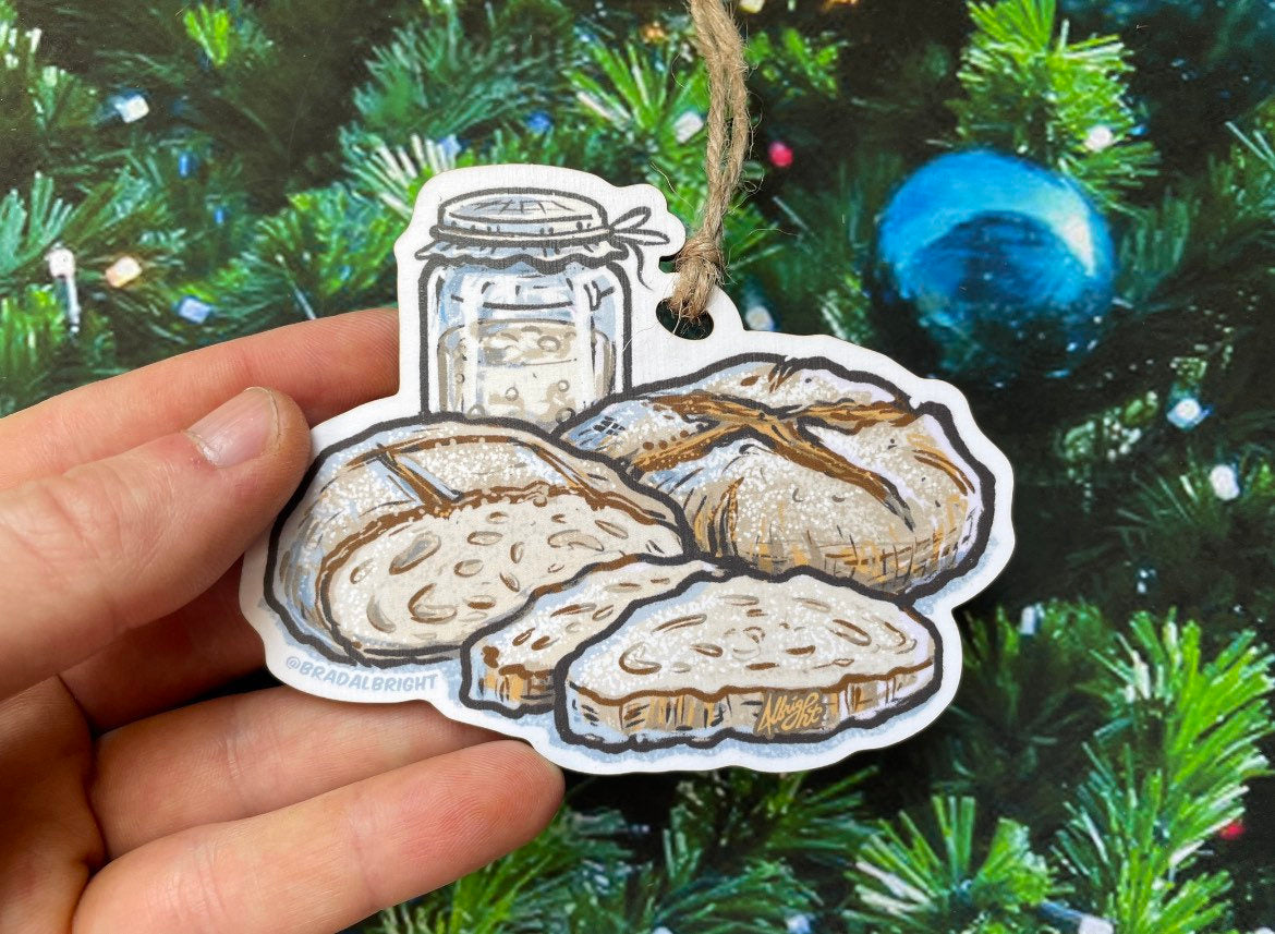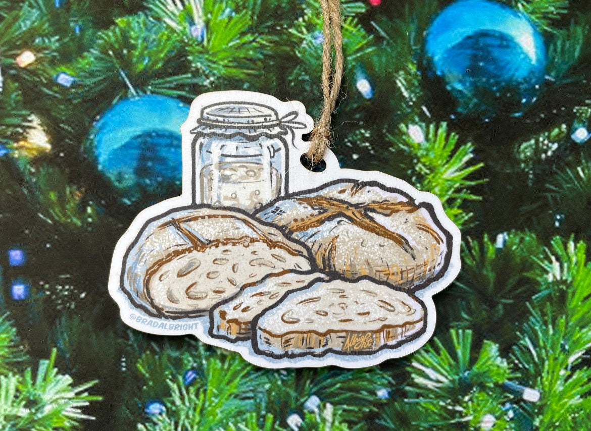 Sourdough Starter & Handmade Bread Loaf - Christmas Ornament - Hand Drawn Wood Ornament
